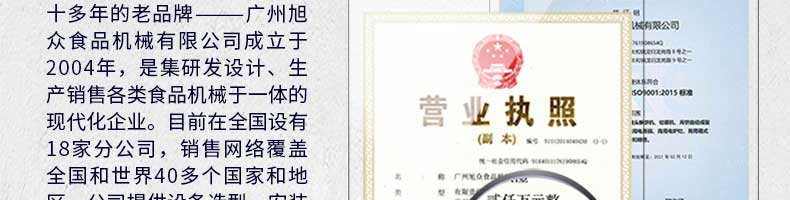 廣州旭眾食品機(jī)械有限公司是一家集科研開(kāi)發(fā),生產(chǎn)設(shè)計(jì),營(yíng)銷服務(wù)為一體的現(xiàn)代化生產(chǎn)企業(yè)?,F(xiàn)代化生產(chǎn)車間,精湛制造技術(shù),所產(chǎn)機(jī)械歷經(jīng)市場(chǎng)重重考驗(yàn),不斷贏得海內(nèi)外客戶的贊譽(yù)。