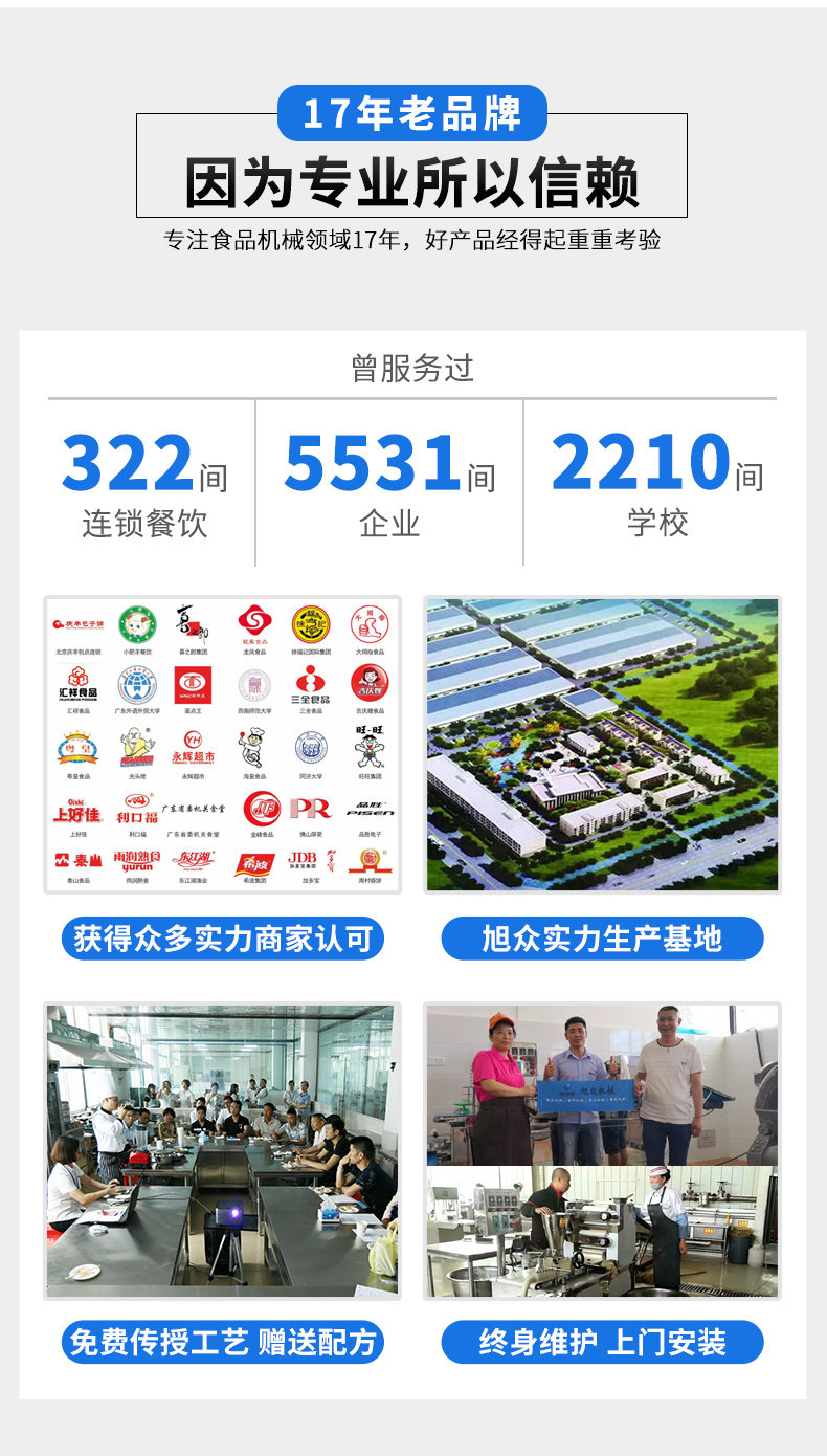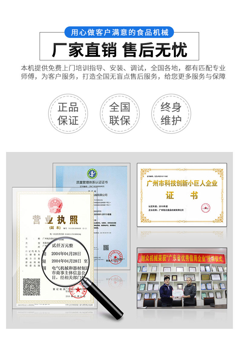 廣州旭眾食品機(jī)械有限公司是一家集科研開發(fā),生產(chǎn)設(shè)計(jì),營銷服務(wù)為一體的現(xiàn)代化生產(chǎn)企業(yè)。現(xiàn)代化生產(chǎn)車間,精湛制造技術(shù),所產(chǎn)機(jī)械歷經(jīng)市場重重考驗(yàn),不斷贏得海內(nèi)外客戶的贊譽(yù)。