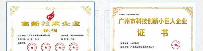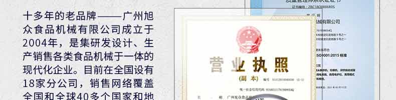 廣州旭眾食品機(jī)械有限公司是一家集科研開(kāi)發(fā),生產(chǎn)設(shè)計(jì),營(yíng)銷(xiāo)服務(wù)為一體的現(xiàn)代化生產(chǎn)企業(yè)?,F(xiàn)代化生產(chǎn)車(chē)間,精湛制造技術(shù),所產(chǎn)機(jī)械歷經(jīng)市場(chǎng)重重考驗(yàn),不斷贏得海內(nèi)外客戶(hù)的贊譽(yù)。