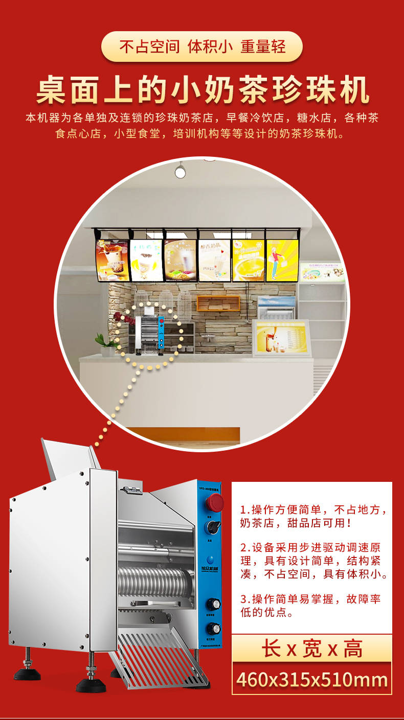 VFD-900珍珠奶茶機,奶茶店、甜品店可用??缮a(chǎn)奶茶珍珠,果蔬圓子,無餡湯圓,水晶湯圓,各種芋圓。不占空間、體積小、重量輕,桌面上的小奶茶珍珠機。告別手工繁瑣的工序,省時省力,輕松解決手工麻煩,成本高等一系列問題