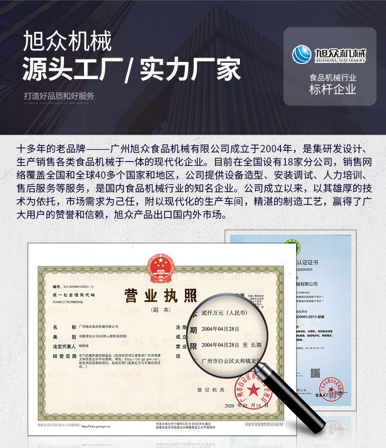 廣州旭眾食品機(jī)械有限公司是一家集科研開發(fā),生產(chǎn)設(shè)計(jì),營銷服務(wù)為一體的現(xiàn)代化生產(chǎn)企業(yè)?,F(xiàn)代化生產(chǎn)車間,精湛制造技術(shù),所產(chǎn)機(jī)械歷經(jīng)市場重重考驗(yàn),不斷贏得海內(nèi)外客戶的贊譽(yù)。