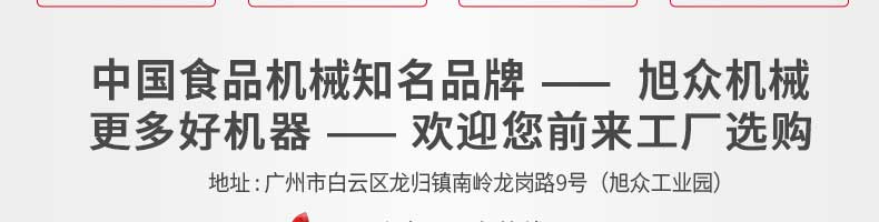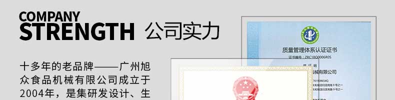 廣州旭眾食品機(jī)械有限公司是一家集科研開發(fā),生產(chǎn)設(shè)計(jì),營(yíng)銷服務(wù)為一體的現(xiàn)代化生產(chǎn)企業(yè)?,F(xiàn)代化生產(chǎn)車間,精湛制造技術(shù),所產(chǎn)機(jī)械歷經(jīng)市場(chǎng)重重考驗(yàn),不斷贏得海內(nèi)外客戶的贊譽(yù)。