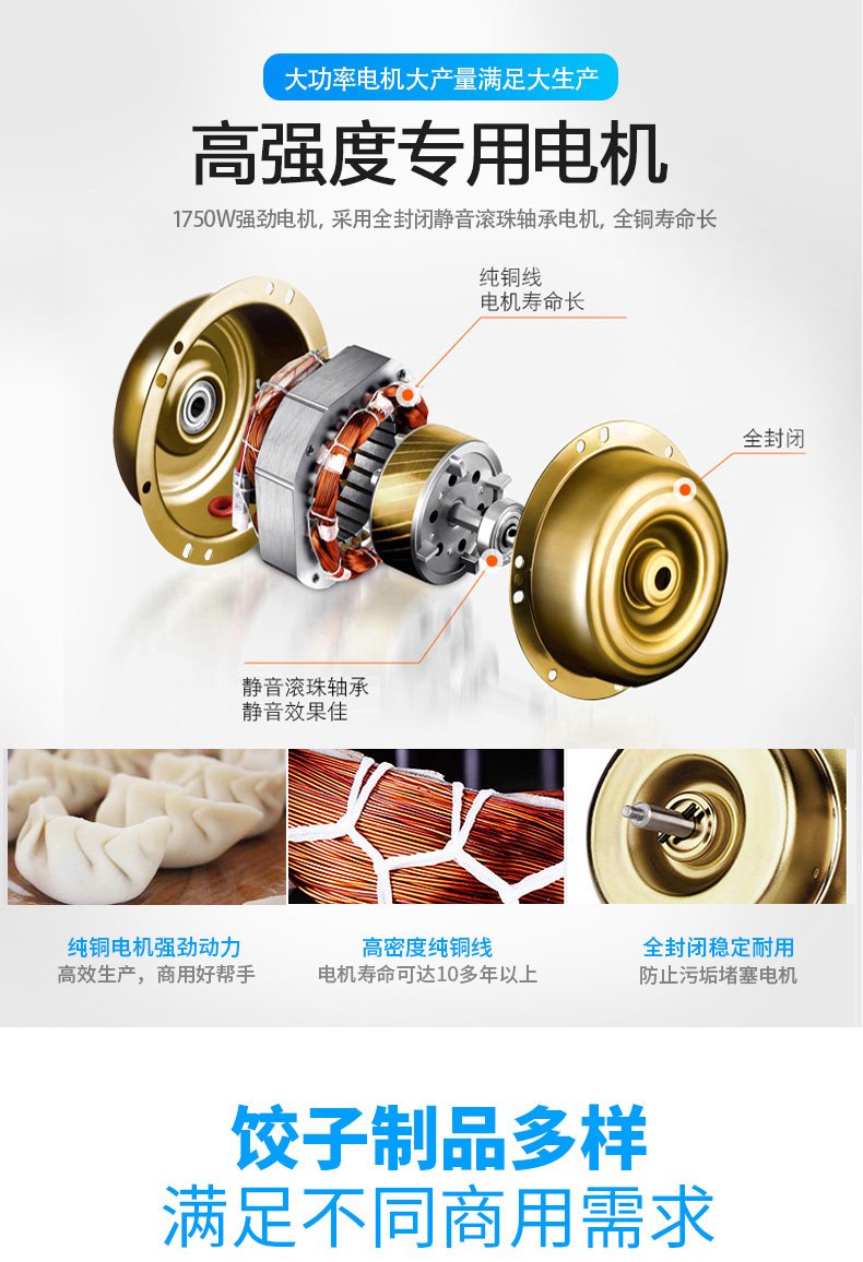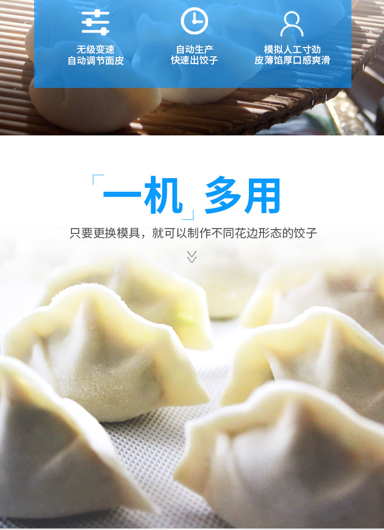 名稱JGB-210型仿手工餃子機(jī) 電源220/380V(見機(jī)器名牌) 功率1.75kw 產(chǎn)量0-20000個(gè)/小時(shí) 尺寸外形尺寸2220*700*1300mm 重量330kg 規(guī)格15-35克/個(gè) 其他