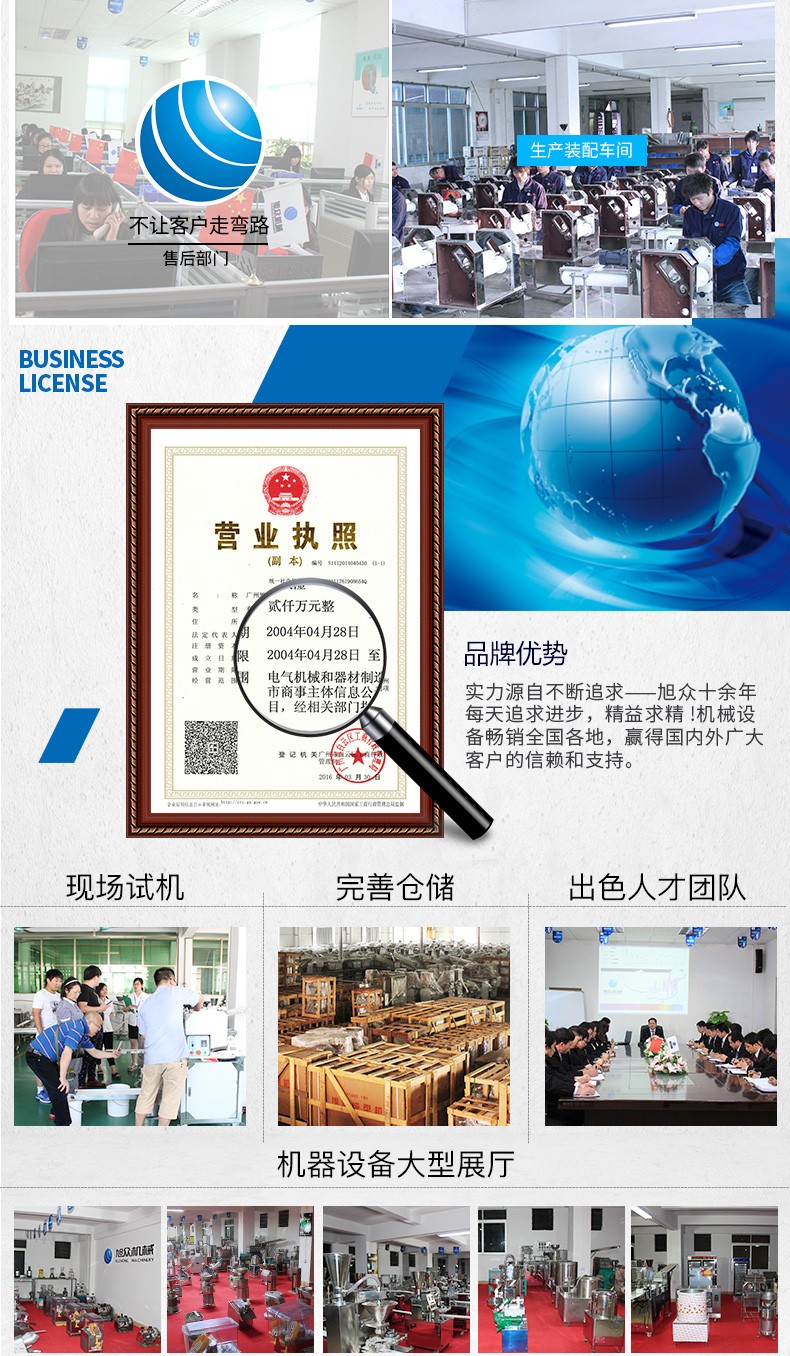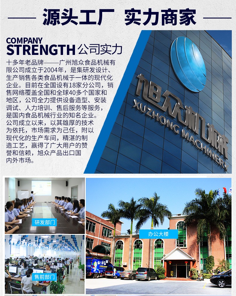 廣州旭眾食品機(jī)械有限公司是一家集科研開發(fā),生產(chǎn)設(shè)計(jì),營(yíng)銷服務(wù)為一體的現(xiàn)代化生產(chǎn)企業(yè)?,F(xiàn)代化生產(chǎn)車間,精湛制造技術(shù),所產(chǎn)機(jī)械歷經(jīng)市場(chǎng)重重考驗(yàn),不斷贏得海內(nèi)外客戶的贊譽(yù)。