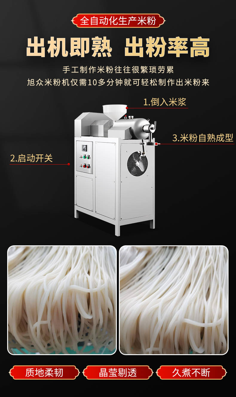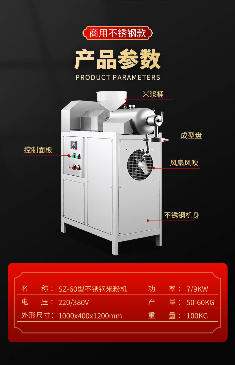 SZ-60不銹鋼米粉機(jī),可生產(chǎn)米粉、米線(xiàn)、桂林米粉、過(guò)橋米線(xiàn)、年糕、糍粑等產(chǎn)品。各種形狀都可生產(chǎn)(圓、扁),加工食品外表光滑,厚薄、寬窄、粗細(xì)均勻可調(diào),筋軟適度,有彈性,口感柔軟、味道純正。