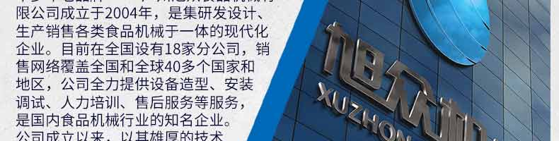 廣州旭眾食品機械有限公司是一家集科研開發(fā),生產(chǎn)設(shè)計,營銷服務(wù)為一體的現(xiàn)代化生產(chǎn)企業(yè)?,F(xiàn)代化生產(chǎn)車間,精湛制造技術(shù),所產(chǎn)機械歷經(jīng)市場重重考驗,不斷贏得海內(nèi)外客戶的贊譽。