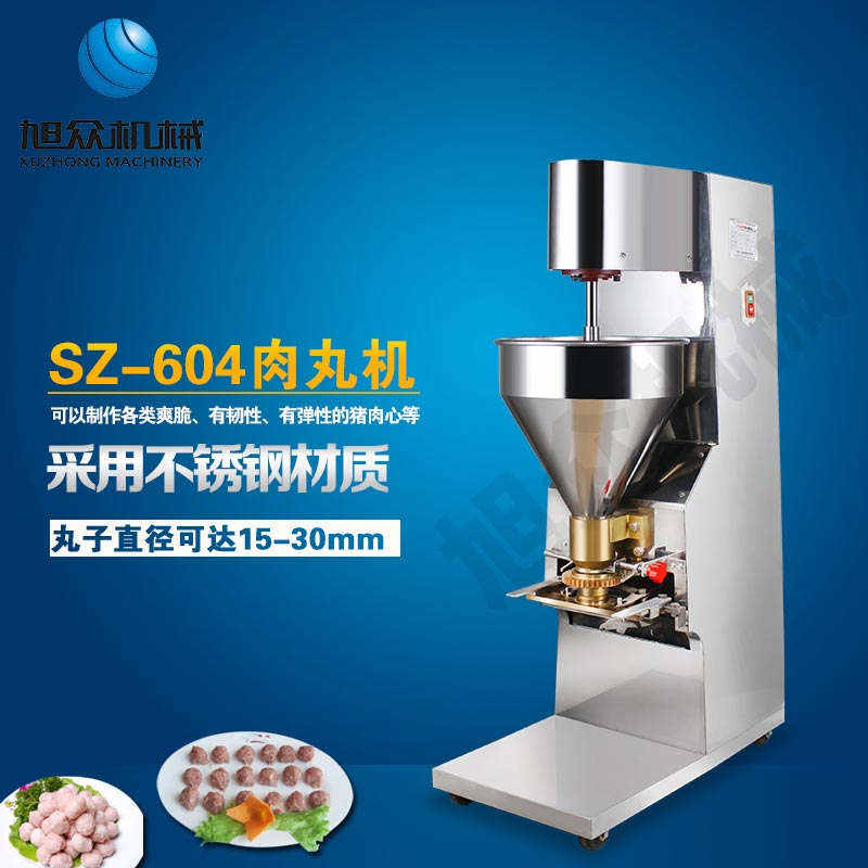 SZ-604肉丸成型機(jī),肉丸成型機(jī)采用不銹鋼材質(zhì),丸子直徑可達(dá)15-35mm,可以制作各類爽脆,有韌性、有彈性的豬肉丸、魚丸、牛肉丸、貢丸、雞肉丸等