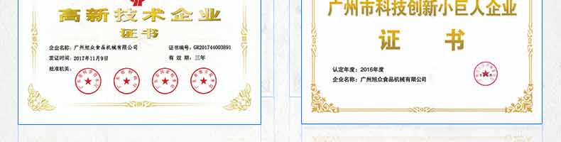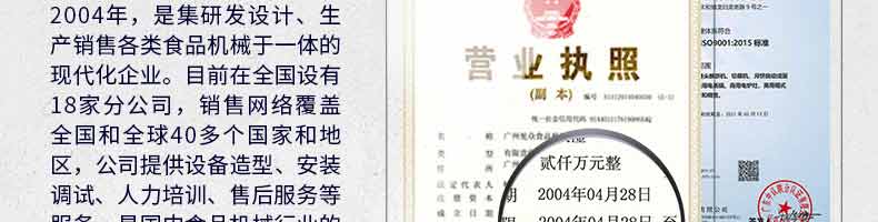 廣州旭眾食品機(jī)械有限公司是一家集科研開(kāi)發(fā),生產(chǎn)設(shè)計(jì),營(yíng)銷服務(wù)為一體的現(xiàn)代化生產(chǎn)企業(yè)?,F(xiàn)代化生產(chǎn)車間,精湛制造技術(shù),所產(chǎn)機(jī)械歷經(jīng)市場(chǎng)重重考驗(yàn),不斷贏得海內(nèi)外客戶的贊譽(yù)。