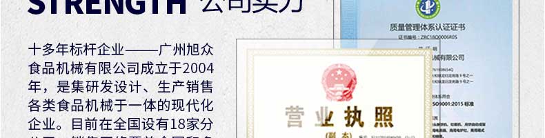 廣州旭眾食品機(jī)械有限公司是一家集科研開發(fā),生產(chǎn)設(shè)計(jì),營(yíng)銷服務(wù)為一體的現(xiàn)代化生產(chǎn)企業(yè)。現(xiàn)代化生產(chǎn)車間,精湛制造技術(shù),所產(chǎn)機(jī)械歷經(jīng)市場(chǎng)重重考驗(yàn),不斷贏得海內(nèi)外客戶的贊譽(yù)。