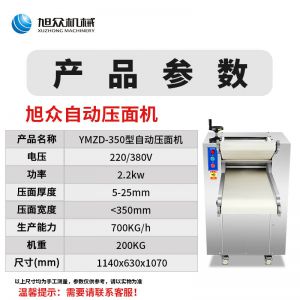 名稱YMZD-350自動壓面機 電源220/380V 功率2.2KW 產(chǎn)量700kg/h 尺寸1140X630X1070mm 重量200KG 規(guī)格壓面厚度5-25mm壓面寬度<350mm 其他