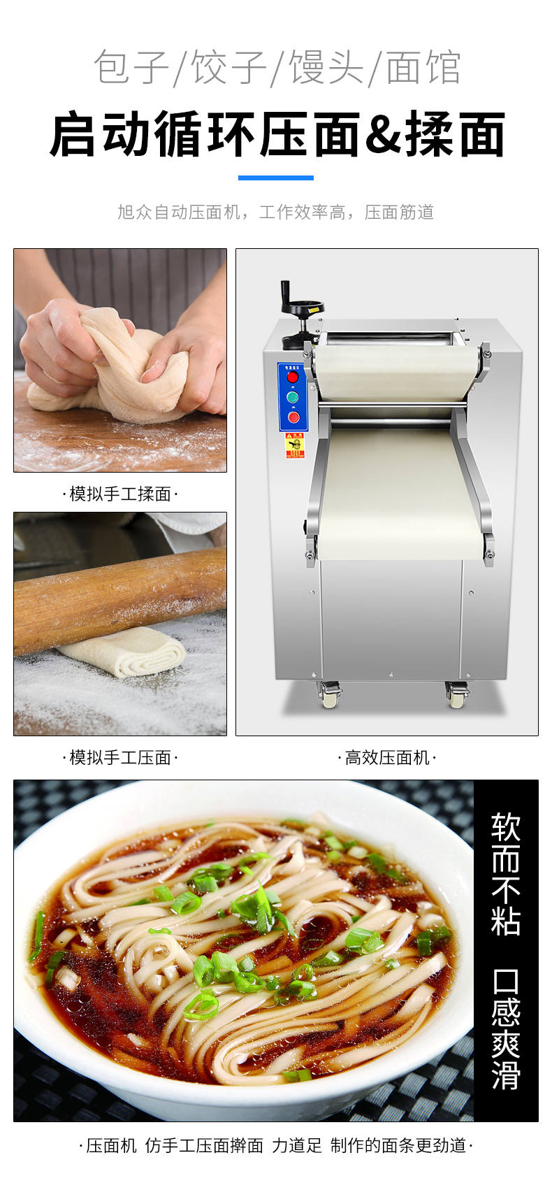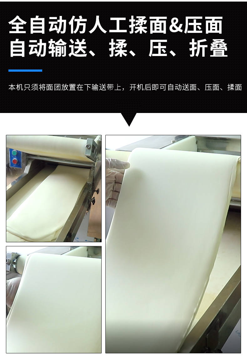 YMZD-350自動壓面機,自動循環(huán)、厚薄可調(diào)。包子、餃子、饅頭,面館等場所適用。啟動循環(huán)壓面、揉面。全自動仿人工揉面,壓面自動輸送、揉、壓、折疊。