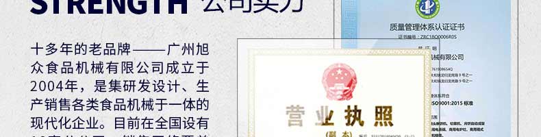 廣州旭眾食品機(jī)械有限公司是一家集科研開發(fā),生產(chǎn)設(shè)計(jì),營(yíng)銷服務(wù)為一體的現(xiàn)代化生產(chǎn)企業(yè)。現(xiàn)代化生產(chǎn)車間,精湛制造技術(shù),所產(chǎn)機(jī)械歷經(jīng)市場(chǎng)重重考驗(yàn),不斷贏得海內(nèi)外客戶的贊譽(yù)。