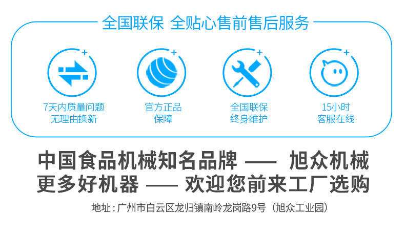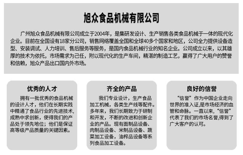 廣州旭眾食品機(jī)械有限公司是一家集科研開發(fā),生產(chǎn)設(shè)計(jì),營銷服務(wù)為一體的現(xiàn)代化生產(chǎn)企業(yè)?,F(xiàn)代化生產(chǎn)車間,精湛制造技術(shù),所產(chǎn)機(jī)械歷經(jīng)市場(chǎng)重重考驗(yàn),不斷贏得海內(nèi)外客戶的贊譽(yù)。